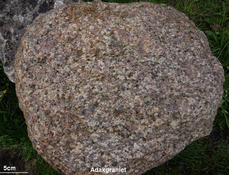 Deze zwerfsteen toont een randstuk van porfierische Avaviken-graniet met Adak-graniet (links).