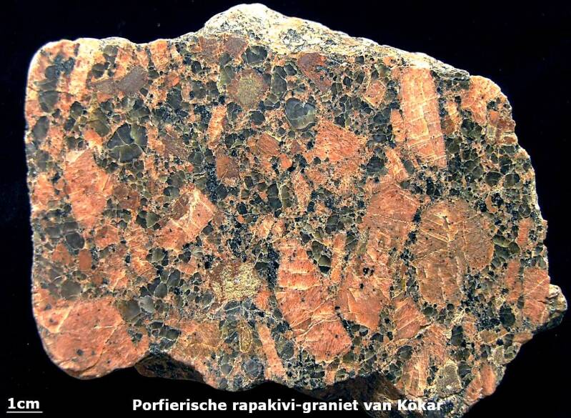 De grotere ovoïden in Viborgiet missen vaak de karakteristieke rand van plagioklaas. Linksonder is een ovoïde zonder plagioklaasrand zichtbaar.