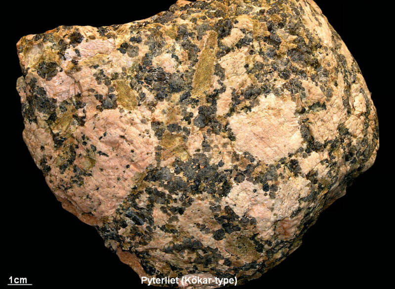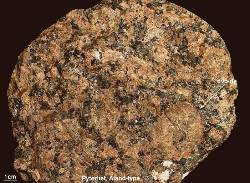 Dit gesteente zou een pyterlietische Viborgiet genoemd mogen worden. Rechtsboven is een grote kaliveldspaat-ovoïde zichtbaar met talrijke zwarte insluitsels van biotiet en hoornblende. Links een grijze, insluitselrijke ovoïde met een relatief dikke rand van plagioklaas.