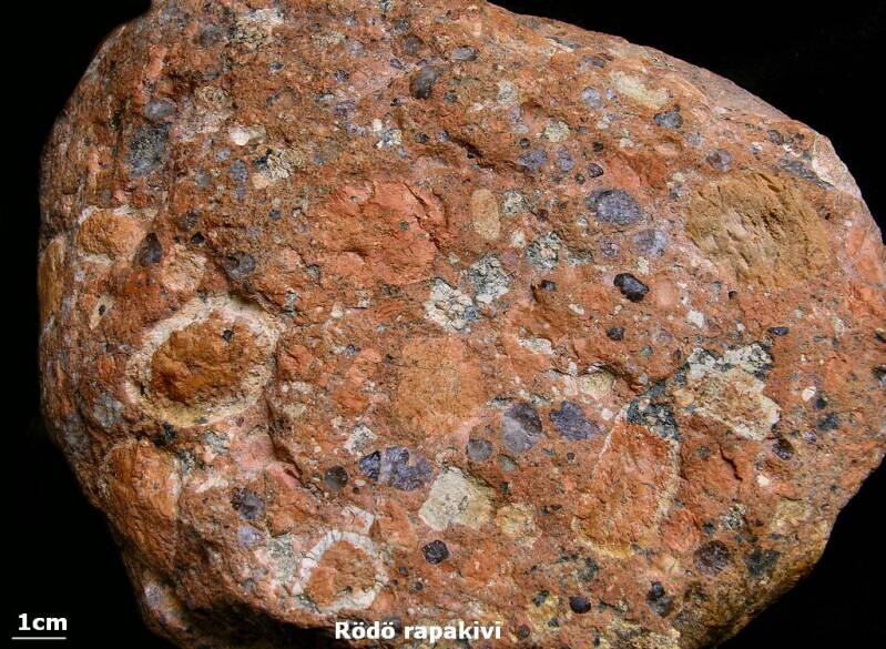 Een typische Viborgiet uit het oosten van Finland met talrijke ovoïden van kaliveldspaat, die omgeven zijn door een rand van plagioklaas. In de ovoïden zijn talrijke kleine insluitsels aanwezig van biotiet, hoornblende en ook van kwarts.