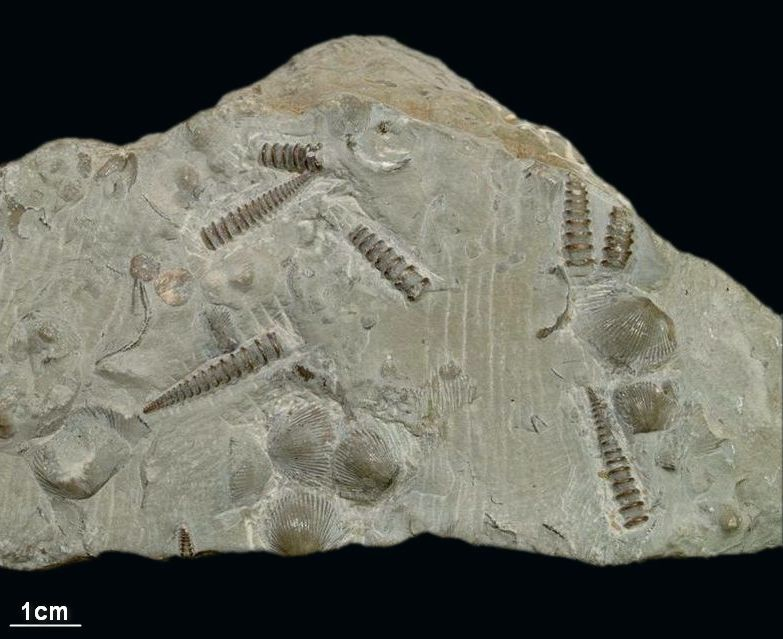 Kalksteen ontstaan uit kalkslib dat zich op de bodem van warme zeeën vormt, vooral uit resten van skeletjes en kalken huisjes van zeeorganismen. Kalksteen is vaak goed gelaagd. Op de laagvlakken treffen we dikwijls allerlei fossielen aan. De geribbelde trechtertjes hierboven zijn die van Tentaculites, een Silurisch vleugelslakje. De 'bobbels' zijn schelpen (brachiopoden). Het grijze oppervlak is dof door de aanwezigheid van kleideeltjes. Kleihoudende kalkstenen noemt men wel kalkmergel of kleimergel, afhankelijk van het percentage van beide bestanddelen.