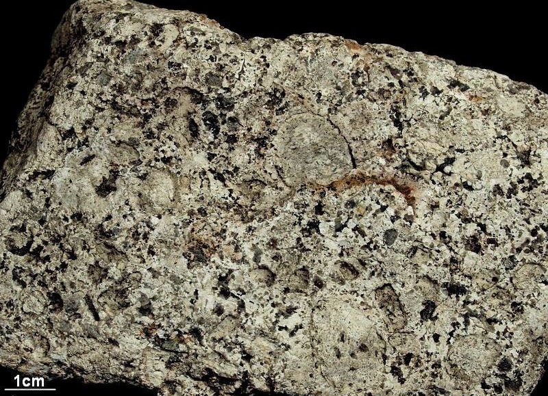 In de dunne zandige keileemlaag is uit deze gabbro in de loop van de tijd alle plagioklaasveldspaat door oplossing verdwenen. Het mineraal laat gaten en putjes na. Pas bij het doorslaan blijkt dat het gesteente naast veel donkere mineralen flink wat plagioklaas bevat.
