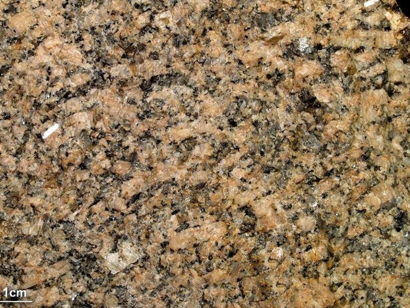 Het gepolijste oppervlak toont dat het gesteente in onverweerde toestand fraai dieprood van kleur is. De witte vlekjes zijn van plagioklaas.Het 'rood' is van kaliveldspaat. De kwartsen zijn blauw-grijs.